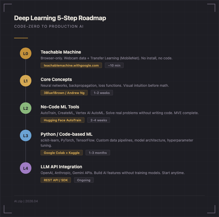 이 가이드는 코드 없이 시작해서 프로덕션 AI까지 이르는 5단계 로드맵을 따른다. Level 0(직관적 이해)과 Level 1(No-Code ML)은 코딩 없이 진행할 수 있다. Level 2부터 Python을 사용하며, Level 4(LLM API)는 코딩 경험과 무관하게 지금 바로 시작할 수 있다. 이 구조를 채택한 이유는 Reddit r/MachineLearning과 DeepLearning.AI 커뮤니티에서 반복적으로 확인되는 조언 - "만들면서 배워라(learn by building)" - 에 기반한다. Fast.ai 창립자 Jeremy Howard도 "이론부터 시작하면 대부분 포기한다. 무언가 동작하는 것을 먼저 만들어야 한다"고 강조한 바 있다.