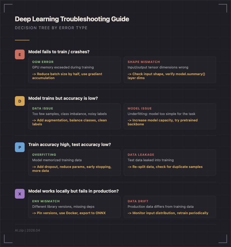 가장 흔한 원인은 데이터 부족이다. Flowygo에 따르면 ML 프로젝트의 85%가 부적절한 데이터로 인해 실패한다. 해결 순서: