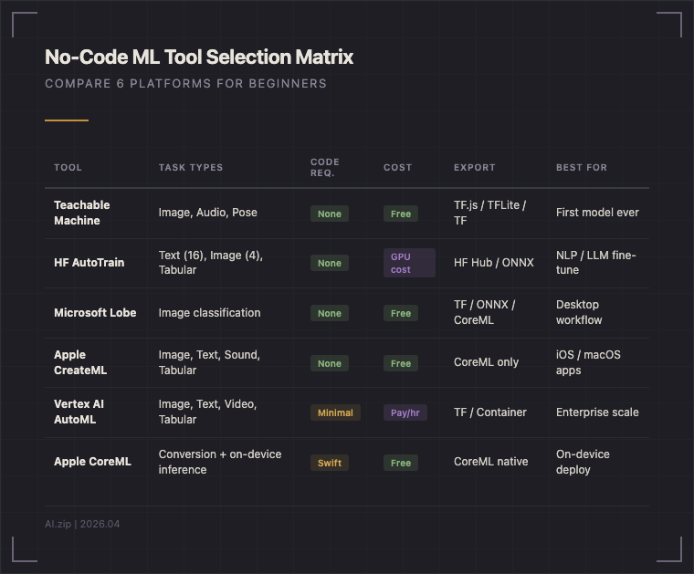 Level 1에서 텍스트/LLM 작업이 필요하다면 Hugging Face AutoTrain이 적합하다. AutoTrain은 16가지 텍스트 태스크(LLM 파인튜닝, 텍스트 분류, 토큰 분류, Seq2Seq 등)와 4가지 이미지 태스크를 지원하며, Apache 2.0 오픈소스로 무료다(GPU 비용만 별도). 경쟁 도구인 Google Cloud AutoML이나 Amazon SageMaker Autopilot에 비해 지원 태스크 범위가 넓고, Hugging Face Hub의 수십만 모델과 직접 연동된다는 점이 차별화 포인트다.