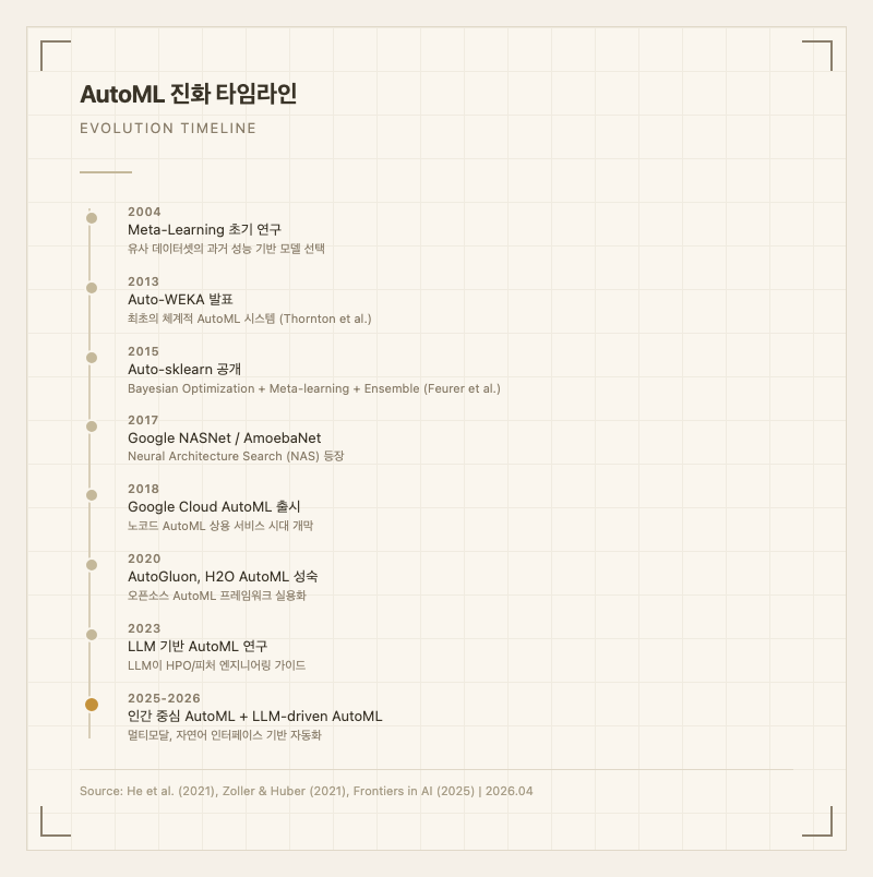 AutoML의 개념은 2013년 Auto-WEKA(Thornton et al.)에서 체계화되었으며, 2015년 Auto-sklearn(Feurer et al.)이 Bayesian Optimization + 메타러닝 + 앙상블 조합으로 AutoML Challenge에서 우승하며 실용성을 입증했습니다. ↩