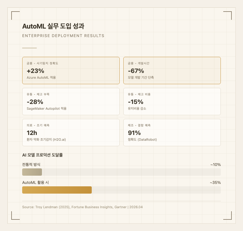 이 수치가 실무에서 의미하는 것: 표준적인 분류/회귀 문제에서 AutoML은 전문가 수준의 성능을 1/20의 시간으로 달성할 수 있으나, 고도로 전문화된 도메인에서는 여전히 전문가의 수동 최적화가 필요합니다.