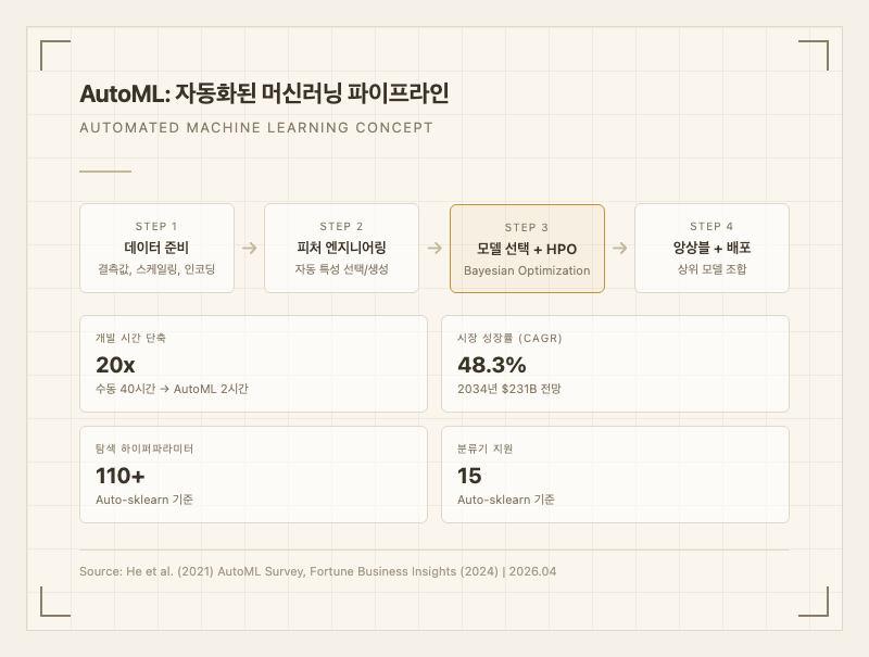 기존 머신러닝 개발 방식에서는 데이터 전처리, 피처 엔지니어링, 알고리즘 선택, 하이퍼파라미터 튜닝, 모델 평가 등 각 단계를 전문가가 수동으로 수행해야 했습니다. 한 번의 실험 사이클에 수일에서 수주가 걸리고, 최적의 조합을 찾기 위해 수십-수백 번의 반복이 필요했습니다. AutoML은 이 전체 파이프라인을 자동으로 탐색합니다. 데이터를 입력하면 전처리부터 최종 모델 선택까지 자동으로 수행하여, 전문가 수준의 결과를 비전문가도 얻을 수 있게 해줍니다1.