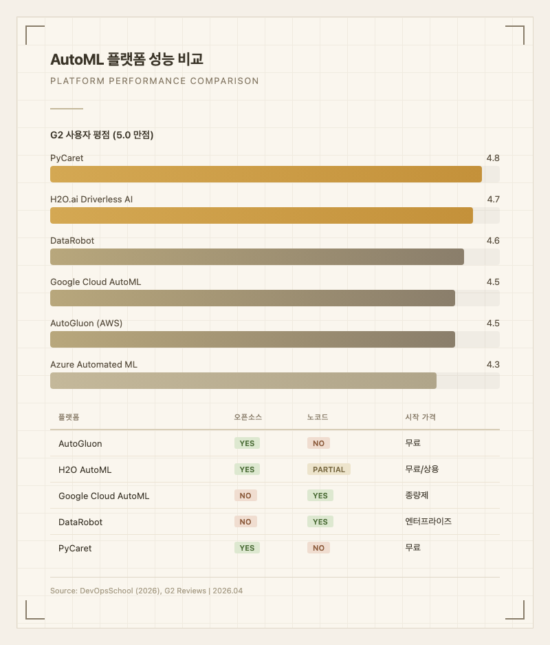 | H2O AutoML | 분산 처리, 리더보드 자동 생성, 스태킹 앙상블 | 대규모 데이터 강점 | 오픈소스/상용 | H2O.ai |