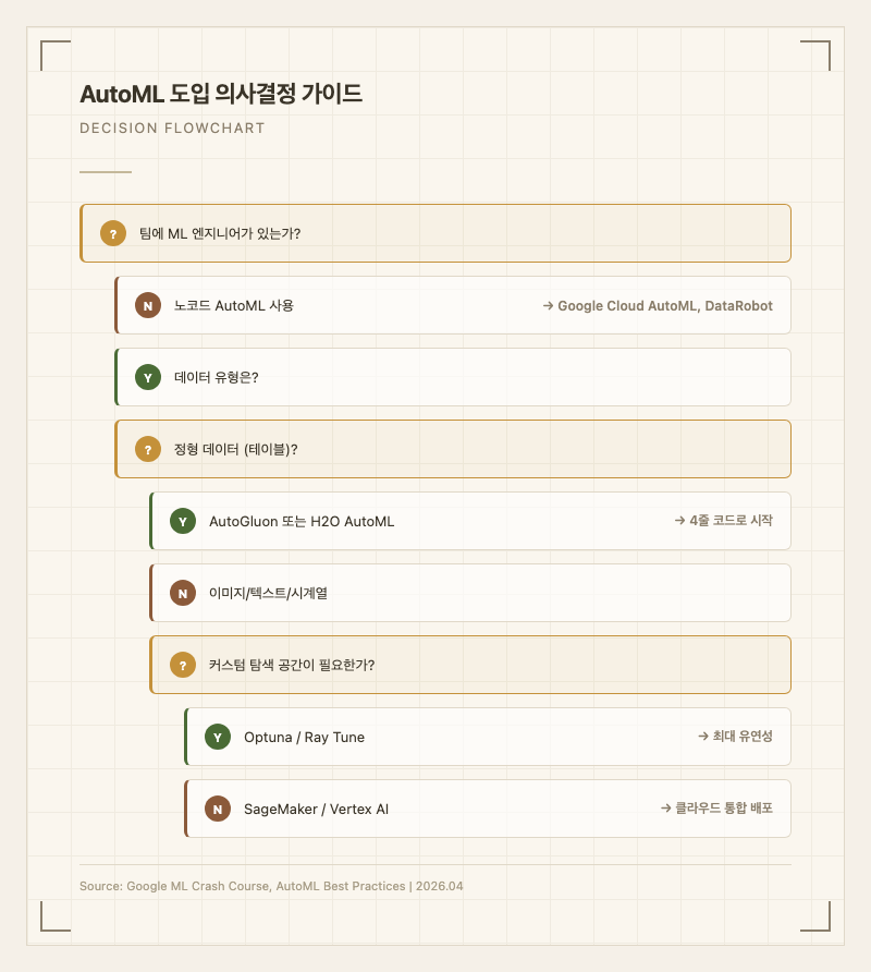 한계가 치명적인 시나리오: 의료 진단, 자율주행, 금융 거래 등 모델의 의사결정 과정을 반드시 설명해야 하는 고위험 도메인에서는 AutoML의 블랙박스 특성이 규제 준수를 어렵게 만듭니다.