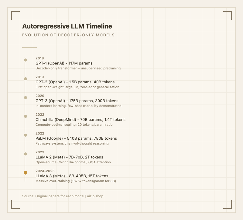 스케일링 법칙: Kaplan et al.(2020)과 Hoffmann et al.(2022, Chinchilla)이 정립한 스케일링 법칙은 자기회귀 사전학습의 설계 원칙을 근본적으로 바꿨다: