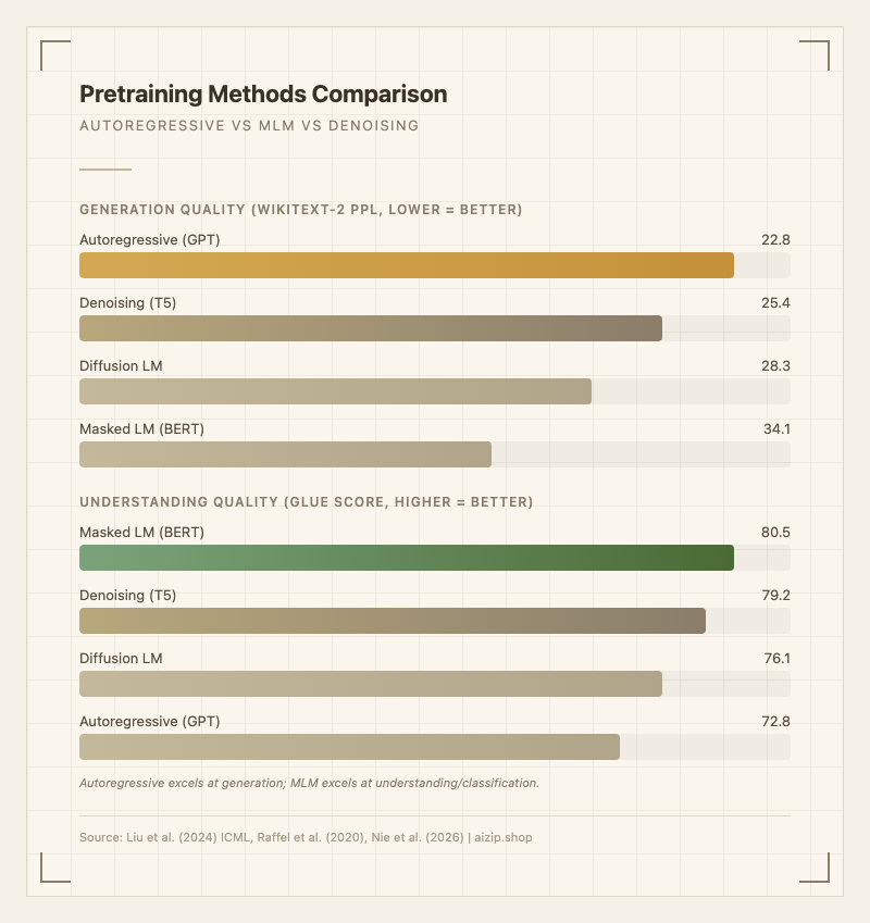 출처: AR vs MLM 수치 - Liu et al. (2024) "Look Ahead or Look Around?" ICML 20241; T5 - Raffel et al. (2020) 원 논문; Diffusion LM - Nie et al. (2026) "Autoregressive vs. Masked Diffusion" 비교 실험