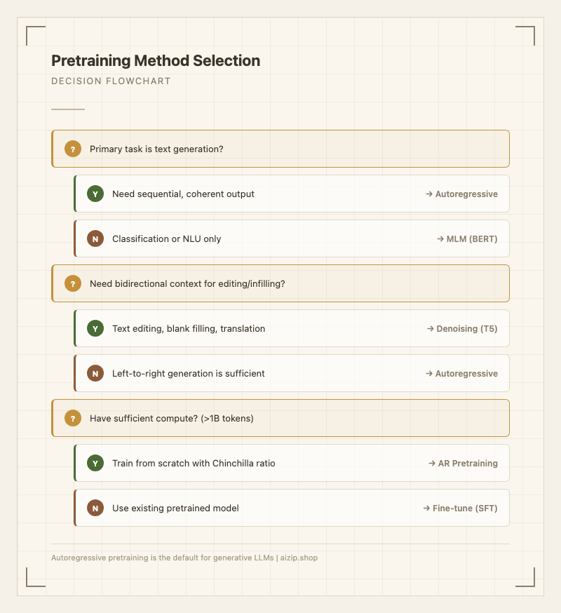 실무에서 이 수치가 의미하는 것: 텍스트를 생성해야 하는 거의 모든 응용(챗봇, 코드 어시스턴트, 글쓰기 도구)에서는 자기회귀 모델이 유일한 현실적 선택지이며, 분류/검색 전용 시스템에서만 MLM 기반 인코더가 여전히 경쟁력을 가진다.