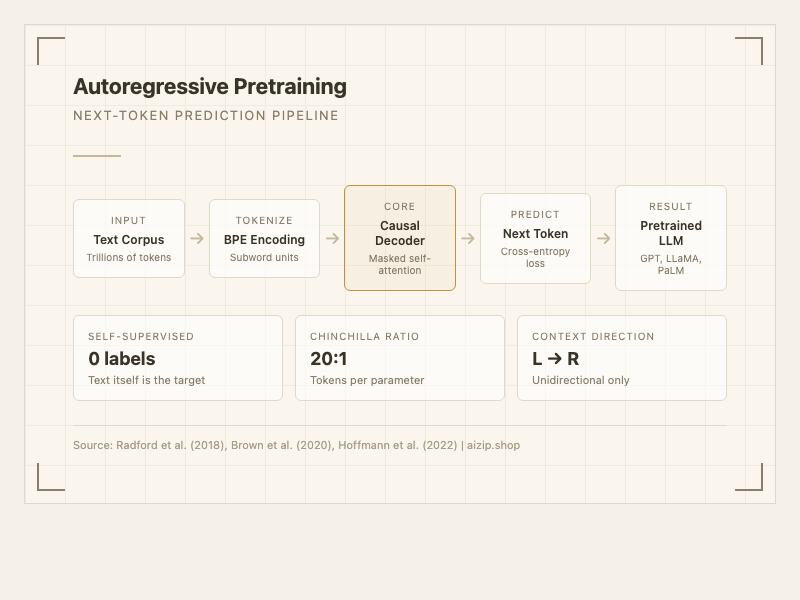자기회귀 사전학습은 AI에게 "다음에 올 단어 맞히기" 게임을 수조 번 반복시켜 언어를 통째로 익히게 하는 훈련 방식이다. 마치 소설을 한 글자씩 가린 채 "다음 글자는?" 퀴즈를 푸는 것처럼, 모델은 앞에 나온 단어들만 보고 바로 뒤에 올 단어를 예측하는 연습을 끊임없이 반복한다. 처음에는 무작위 수준이지만, 수조 개의 토큰을 학습하고 나면 문법 규칙, 사실 관계, 논리적 인과까지 스스로 터득하게 된다.