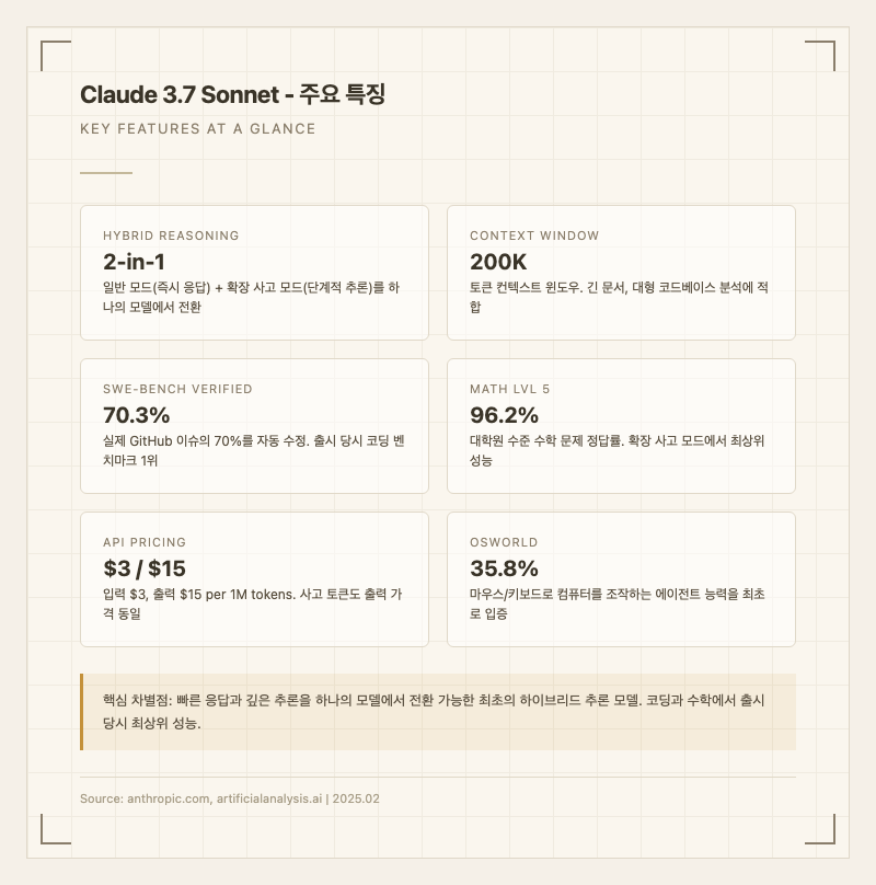Claude 3.7 Sonnet의 핵심 차별화 포인트는 다음과 같다.