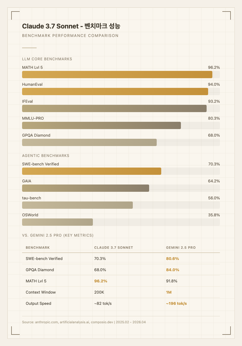한국어 토큰 효율 데이터는 미공개다. Anthropic의 토크나이저 특성상 한국어는 영어 대비 약 2-3배 많은 토큰을 소비하는 것으로 알려져 있으나, Claude 3.7 Sonnet 고유의 한국어 토큰 효율 측정 데이터는 공개된 바 없다.