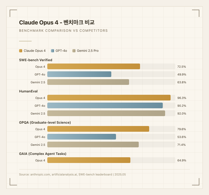 코딩 영역에서는 SWE-bench Verified 72.5%로 출시 당시 세계 최고 기록을 달성했으며, HumanEval 96.3%로 거의 모든 프로그래밍 문제를 정확하게 해결할 수 있는 수준이다. 다만 이후 출시된 Opus 4.5, 4.6에서 이 수치는 더욱 개선되었다.