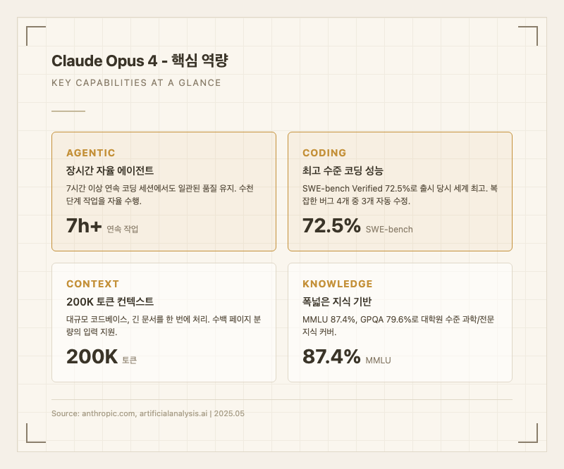 Claude Opus 4는 Anthropic이 2025년 5월 23일 출시한 Claude 4 시리즈의 플래그십 모델로, "인내심 있는 AI"라는 콘셉트 아래 장시간 자율 에이전트 작업에 특화된 대규모 언어 모델이다. 출시 당시 세계 최고의 코딩 모델로 벤치마킹되었으며, 복잡한 소프트웨어 엔지니어링과 에이전트 워크플로우에서 지속적인 성능을 발휘하도록 설계되었다.