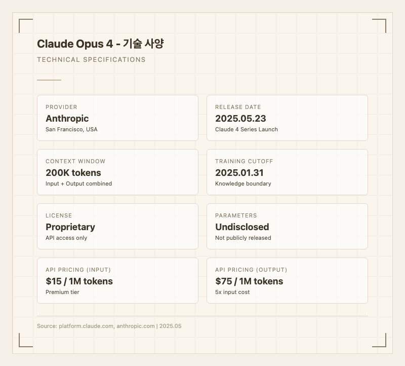 API 가격: 입력 75/1M 토큰. 이는 현재 시점에서 상당히 비싼 가격대로, 이후 출시된 Opus 4.5와 4.6이 동일하거나 더 나은 성능을 25에 제공하면서 가격 대비 성능 면에서 레거시 모델이 되었다.
