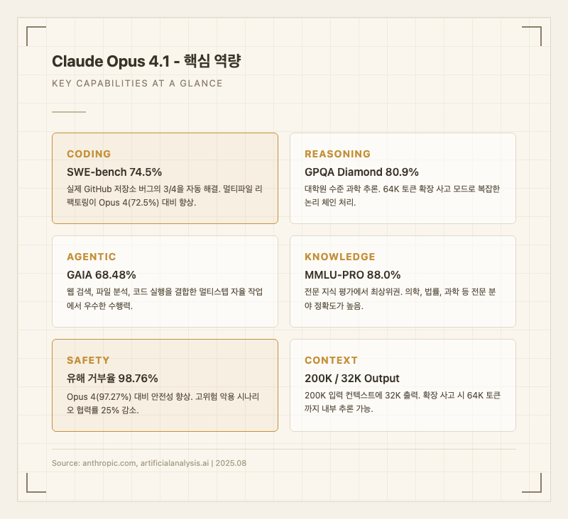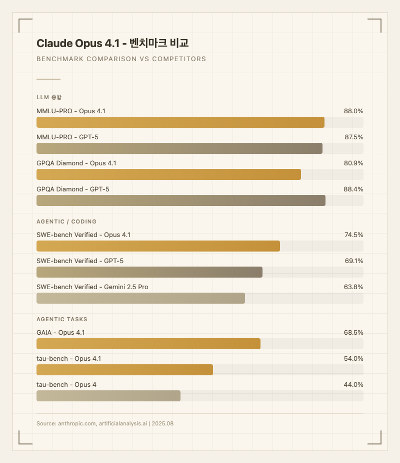 코딩 영역에서 Opus 4.1은 SWE-bench Verified 74.5%로 GPT-5(69.1%)와 Gemini 2.5 Pro(63.8%)를 앞선다. MMLU-PRO 88.0%는 GPT-5(87.5%)와 비슷한 수준. 반면 GPQA Diamond에서는 80.9%로 GPT-5(88.4%)와 Grok 4(88.0%)에 뒤진다. 즉, 코딩은 확실히 강하지만 과학 추론에서는 경쟁 모델에 밀리는 구도다.