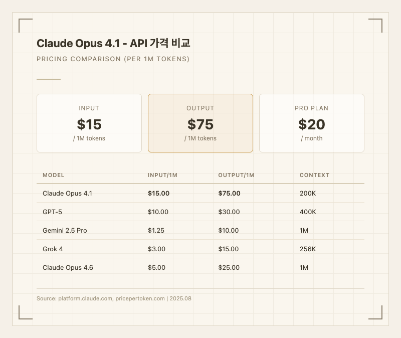 경쟁 모델 대비 가격이 상당히 높다. GPT-5는 입력 30, Gemini 2.5 Pro는 입력 10, 후속 모델인 Opus 4.6도 입력 25로 67% 인하되었다. 실사용자들 사이에서 "성능은 좋은데 가격이 문제"라는 반응이 지배적이며, 고볼륨 엔터프라이즈 배포에는 비용 부담이 크다는 평가다.