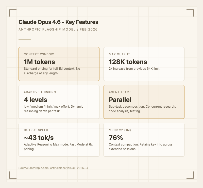 그 외 최대 128K 토큰 출력(이전 64K의 2배), Context Compaction(MRCR v2 76% 정확도)으로 긴 세션에서도 핵심 정보를 유지하는 능력이 추가되었다.