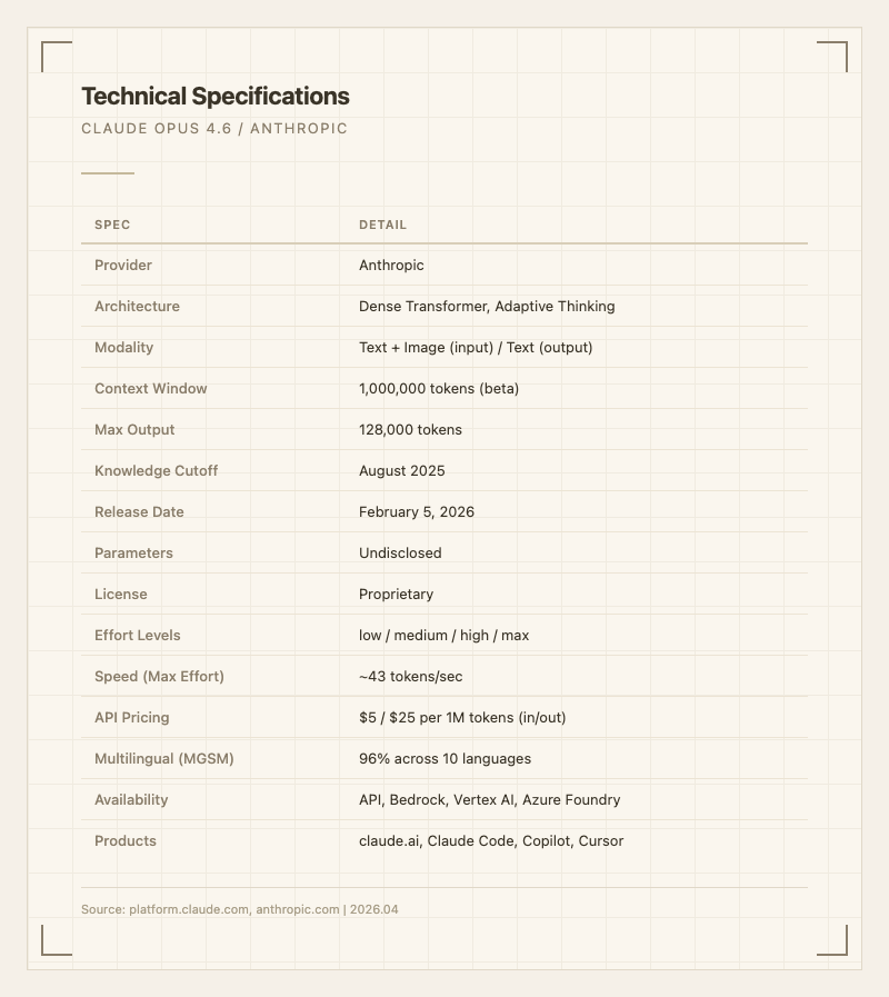 Anthropic API, AWS Bedrock, Google Vertex AI, Azure Foundry에서 사용 가능. model ID는 claude-opus-4-6이다.