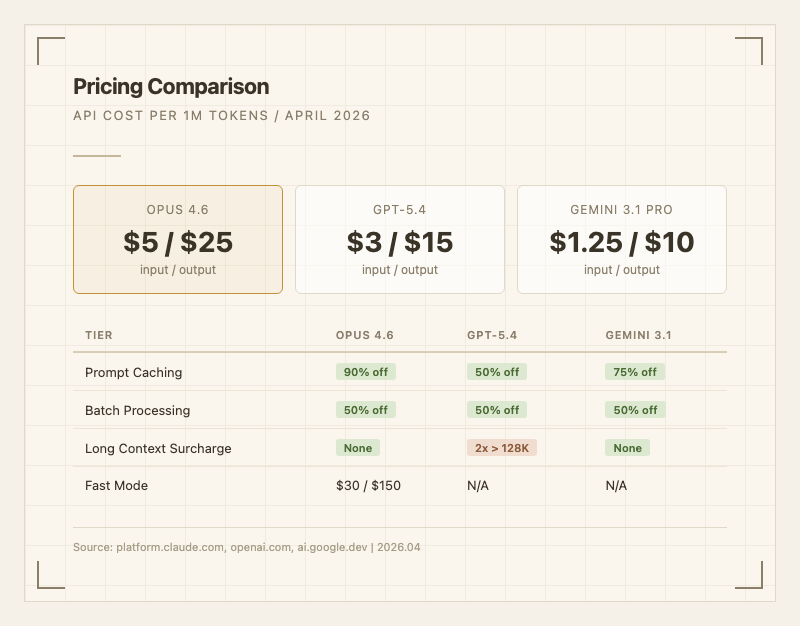실사용자들의 평가는 갈린다. "코딩 에이전트로 쓸 때 투자 대비 확실히 가치가 있다"는 의견과 "토큰 소모가 너무 빨라서 실질 비용이 표시가격보다 훨씬 높다"는 의견이 공존한다. 특히 한국어 사용자들은 영어 대비 토큰 효율이 떨어져서 같은 작업을 해도 비용이 더 나온다. Gemini 3.1 Pro가 10으로 4배 저렴하고, GPT-5.4도 15로 40% 싸다는 점에서 단순 가격 경쟁력은 약하다. 다만 프롬프트 캐싱(최대 90% 절감)과 배치 처리(50% 절감)를 적극 활용하면 비용을 크게 줄일 수 있다.