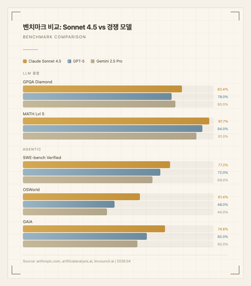벤치마크 수치만 보면 Sonnet 4.5가 코딩과 에이전트 영역에서 확실히 앞서지만, 실사용 체감은 좀 다르다. GPT-5는 짧고 깔끔한 코드 생성에서 더 낫다는 평가가 있고, Gemini 2.5 Pro는 멀티모달 처리와 문서 분석에서 강점을 보인다. "Sonnet 4.5는 코딩의 왕이지만, 모든 면에서 최고는 아니다"라는 것이 커뮤니티의 대체적인 평가다 (출처: gaodalie.substack.com).