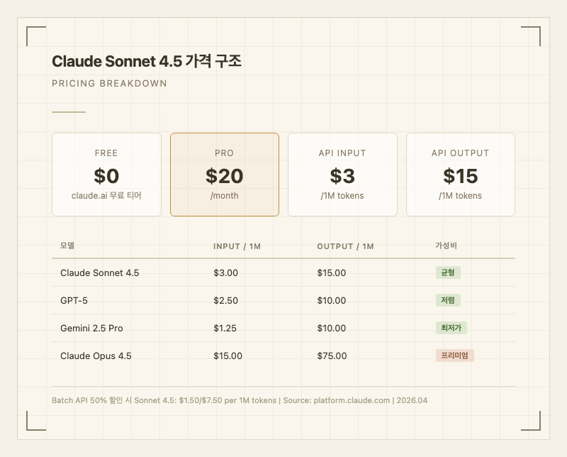 Gemini 2.5 Pro(10)나 GPT-5(10) 대비 출력 토큰 가격이 높은 편이다. 다만 "코딩 에이전트로 쓸 때는 한 번에 제대로 된 결과를 내서 결과적으로 토큰을 덜 쓴다"는 실사용자 평가도 있다. Opus 4.5(75) 대비 5배 저렴하면서 거의 비슷한 성능을 낸다는 점이 가성비 측면에서 가장 큰 강점이다.