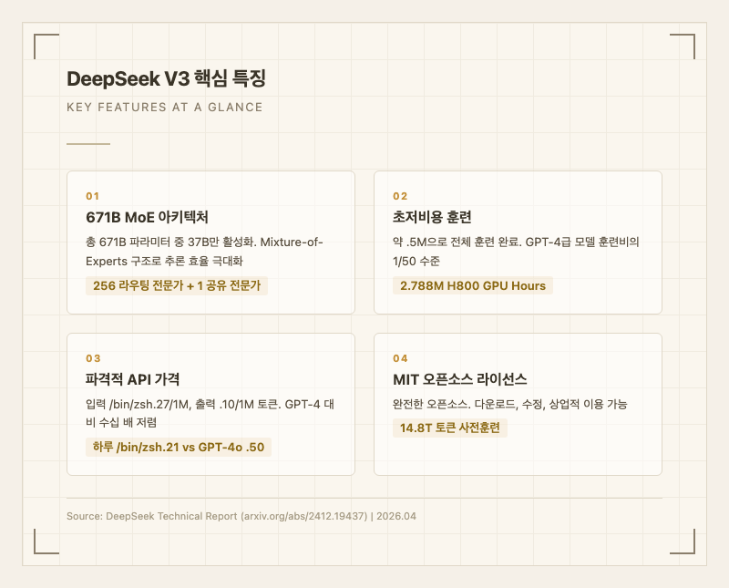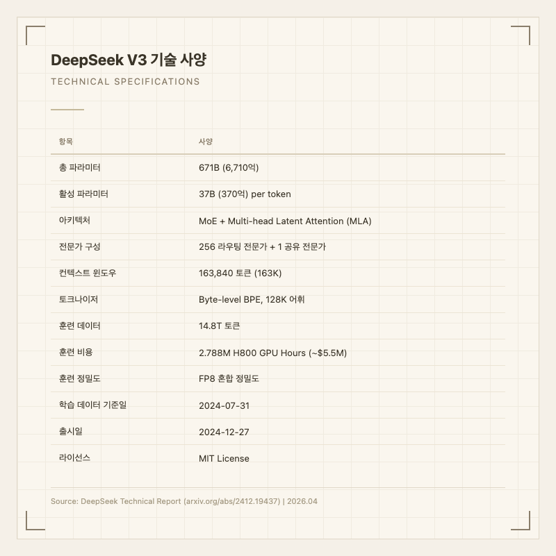 DeepSeek V3는 중국 AI 기업 DeepSeek가 2024년 12월에 공개한 671B Mixture-of-Experts(MoE) 대규모 언어 모델이다. 총 671B 파라미터 중 토큰당 37B만 활성화하는 희소 아키텍처로, 약 $5.5M이라는 파격적 저비용으로 훈련되며 오픈소스 AI 모델의 경제성에 대한 기존 상식을 완전히 뒤집은 모델이다.