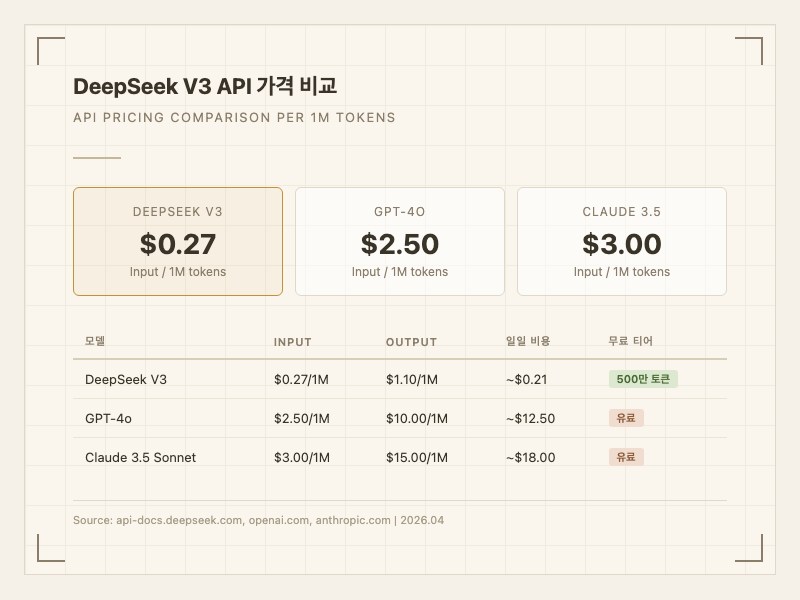 경쟁 모델과 비교하면, GPT-4o는 입력 10.00, Claude 3.5 Sonnet은 입력 15.00이다. DeepSeek V3는 입력 기준 GPT-4o 대비 약 9배, Claude 3.5 대비 약 11배 저렴하다.
