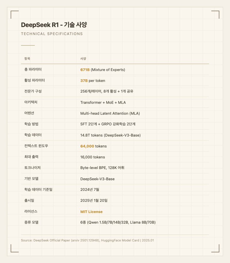 R1의 핵심 아키텍처 혁신은 DeepSeek-V3에서 이어받은 것들이다. MLA(Multi-head Latent Attention)로 추론 시 KV 캐시 메모리를 대폭 절감하고, MoE 구조로 671B 파라미터 중 37B만 활성화해 연산 효율을 높였다. 여기에 GRPO 강화학습을 적용해 추론 능력을 별도로 강화한 것이 R1의 독자적 기여다. 학습 과정에서 약 600K의 추론 관련 샘플과 200K의 비추론 샘플을 사용했다 (출처: 공식 논문 arxiv 2501.12948).