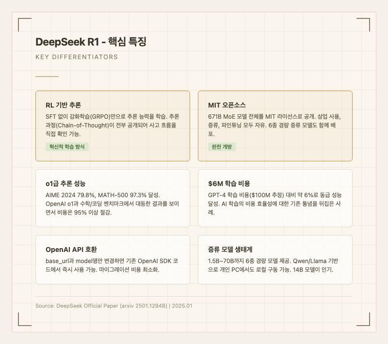 R1의 가장 핵심적인 차별점은 강화학습 기반 추론이다. 대부분의 추론 모델이 인간이 만든 고품질 데이터로 SFT를 먼저 하고 나서 RL로 보정하는 구조인데, R1은 SFT를 거치지 않고 GRPO(Group Relative Policy Optimization) 강화학습만으로 추론 패턴을 자체 발견했다. 정답 여부만 보상 신호로 주고, 추론 과정 자체는 모델이 알아서 만들게 했다는 것이 논문의 핵심 주장이다 (출처: 공식 논문 arxiv 2501.12948).
