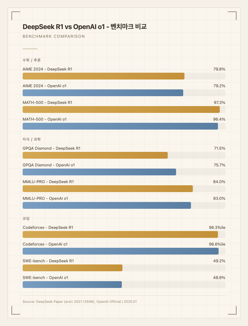 | 벤치마크 | DeepSeek R1 | OpenAI o1 | 비고 |