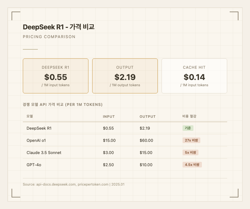 경쟁 모델과 비교하면 OpenAI o1(입력 60) 대비 약 27배 저렴하다. Claude 3.5 Sonnet(입력 15) 대비로도 5배 이상 저렴하고, GPT-4o(입력 10) 대비로도 4.5배 차이가 난다 (출처: pricepertoken.com).