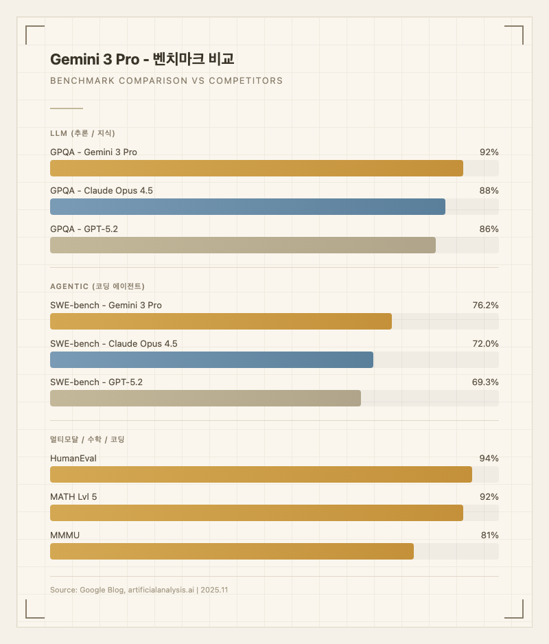 vs Claude Opus 4.5: Arena Elo 근소 차이(1486 vs 1490). 코딩에서는 Opus가 "가장 일관되고 UI 완성도가 높다"는 평가. Gemini 3 Pro는 1M 토큰 컨텍스트와 멀티모달에서 우위. (출처: CosmicJS, MindStudio 비교)