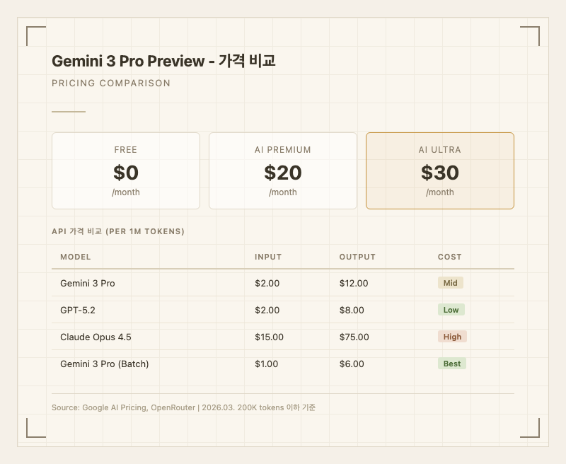 API 가격은 프론티어 모델 중 중간 수준. Claude Opus 4.5(75)보다는 확실히 저렴하지만, GPT-5.2(8)와 비교하면 출력 비용이 더 높다. "Deep Think은 좋은데 Ultra 플랜 1/$6으로 대폭 절감 가능. 1M 컨텍스트를 적극 활용하면 여러 번 API 호출 비용을 아낄 수 있어 대량 문서 분석에서는 오히려 경제적. (출처: Reddit, OpenRouter)