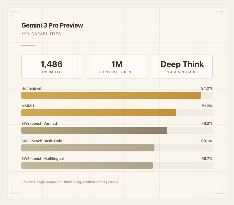 Google DeepMind가 2025년 11월 공개한 Gemini 3 세대 첫 프론티어 모델. Gemini 2.5 Pro의 후속으로, 추론, 코딩, 멀티모달 전 영역에서 대폭 향상되었다. 2026년 3월 9일부로 deprecated되어 Gemini 3.1 Pro Preview로 대체되었지만, AI 모델 시장의 기준을 바꾼 모델로 평가받는다.