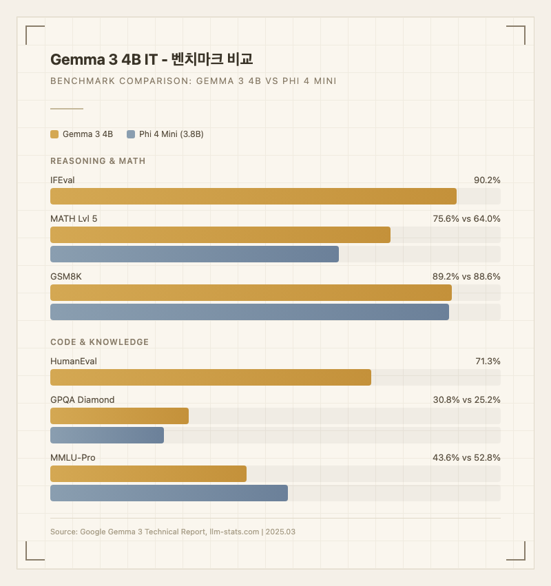 | 벤치마크 | Gemma 3 4B | Phi 4 Mini (3.8B) | 비고 |