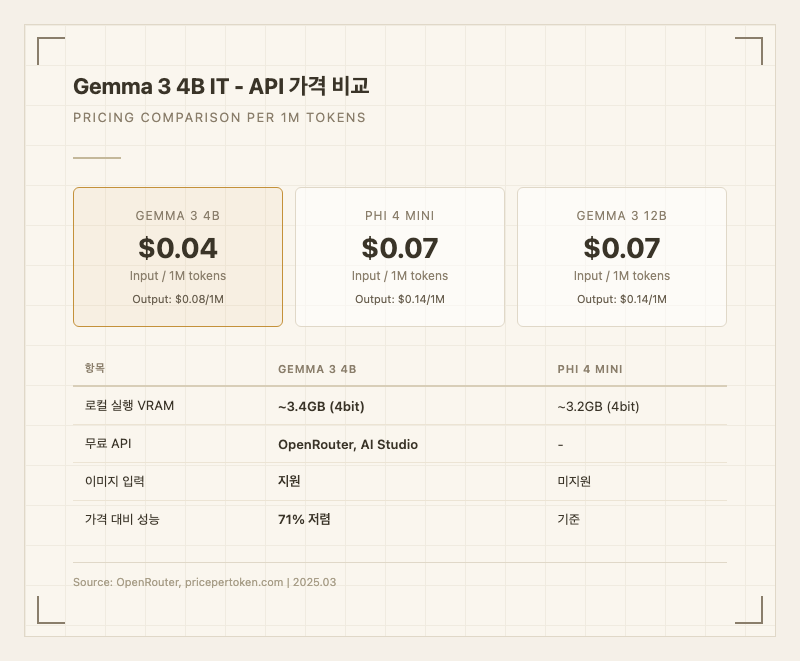 가성비 측면에서 4B 크기 모델 중 현재 가장 경쟁력 있는 위치에 있다. 멀티모달 지원 + 128K 컨텍스트 + 이 가격대의 조합을 제공하는 경쟁 모델은 없다.