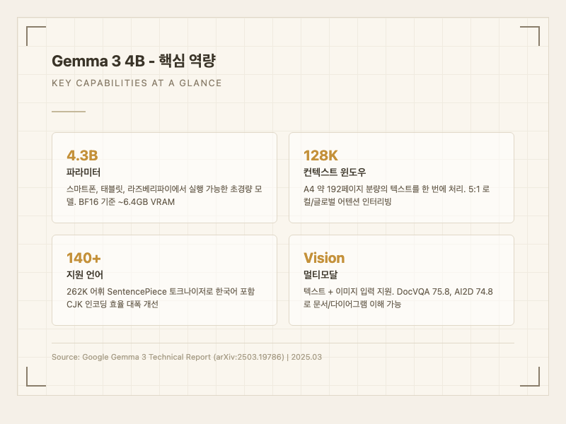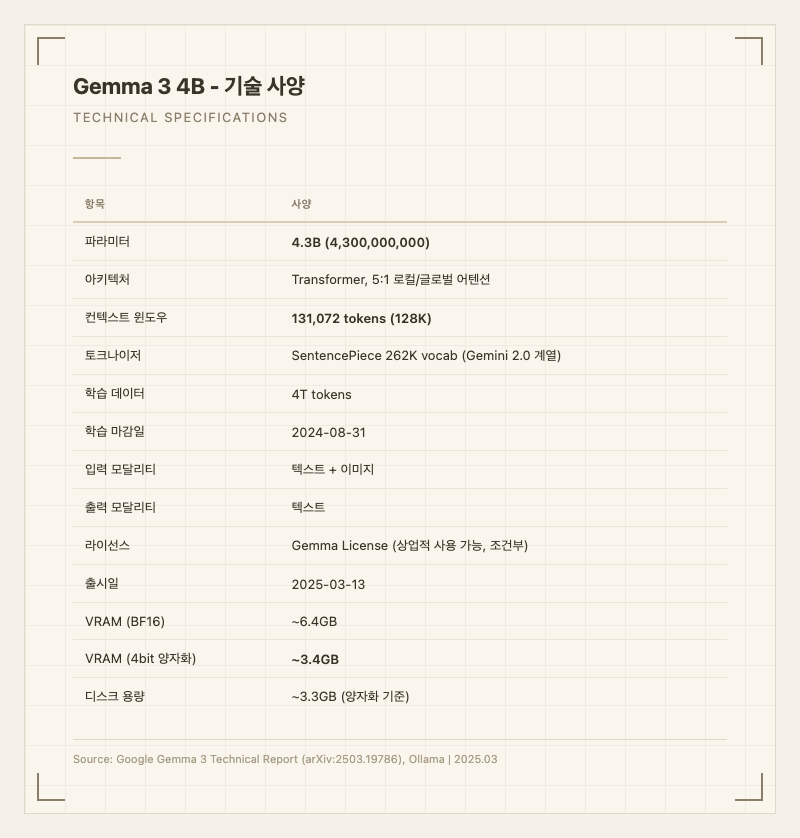 Gemma 3 4B는 Google DeepMind가 2025년 3월에 공개한 43억 파라미터 오픈 웨이트 멀티모달 모델이다. Gemini 2.0 계열의 기술을 기반으로, 텍스트와 이미지를 동시에 이해하면서도 스마트폰이나 라즈베리파이 같은 엣지 디바이스에서 실행할 수 있을 정도로 가볍다. 140개 이상의 언어를 지원하며, 128K 토큰 컨텍스트 윈도우를 탑재해 소형 모델의 한계를 상당 부분 극복했다.