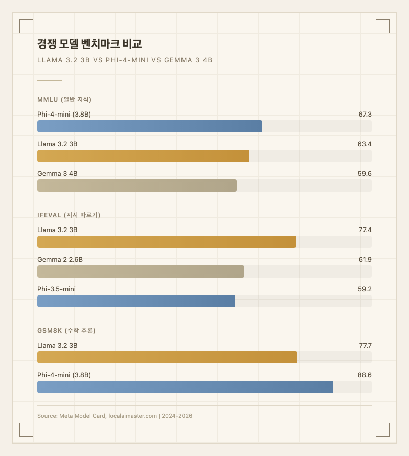 IFEval 77.4는 경쟁 모델인 Gemma 2 2.6B(61.9)와 Phi-3.5-mini(59.2)를 크게 앞서는 수치다. 지시를 따르는 능력에서는 동급 최강이라 할 수 있다. MMLU 63.4도 Gemma 3 4B(59.6)를 앞서지만, Phi-4-mini(67.3)에는 뒤진다 (출처: localaimaster.com).