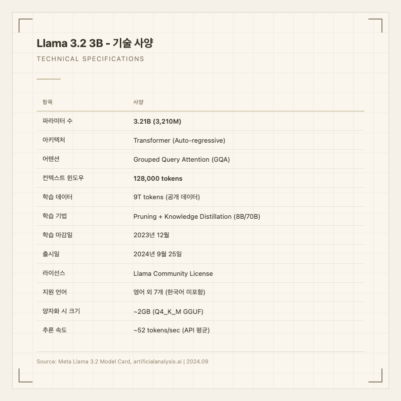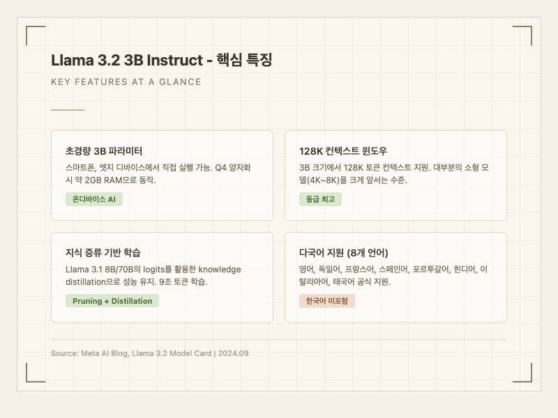 Meta가 2024년 9월 Connect 행사에서 공개한 Llama 3.2 3B Instruct는, 스마트폰이나 엣지 디바이스에서 직접 돌릴 수 있도록 설계된 초경량 언어 모델이다. 3B 파라미터라는 크기에서 실용적인 성능을 뽑아내는 것이 핵심 목표이며, Llama 3.1 8B와 70B 모델의 지식을 증류(distillation)해서 만들었다.