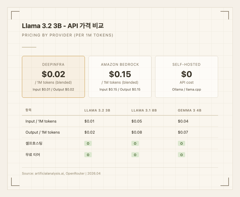 오픈 웨이트 모델이므로 셀프호스팅 시 API 비용은 0이다. 클라우드 API를 통해 사용할 경우 프로바이더별 가격이 다른데, 가장 저렴한 DeepInfra 기준 입력 0.02/1M 토큰이다. OpenRouter에서는 무료 티어도 제공한다.