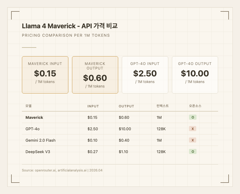 Maverick의 API 가격은 입력 0.60/1M 토큰이다 (최저가 기준). 이는 GPT-4o(입력 10.00)와 비교하면 입력 94%, 출력 94% 저렴한 수준이다. 제공사별 중간값은 입력 0.91/1M 토큰이다 (출처: artificialanalysis.ai).