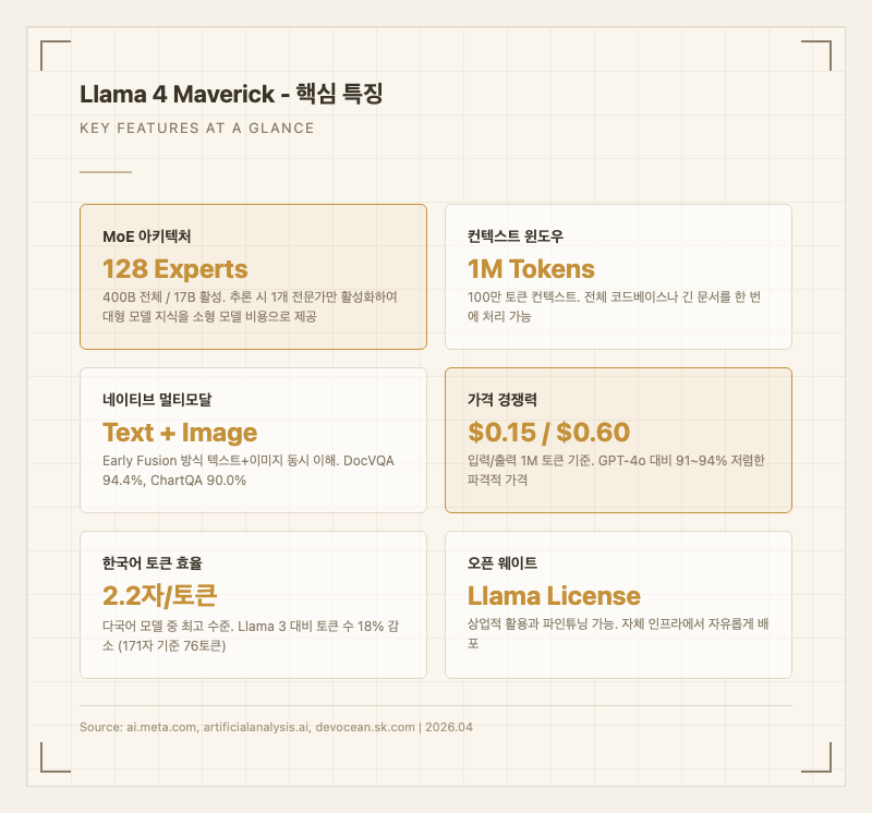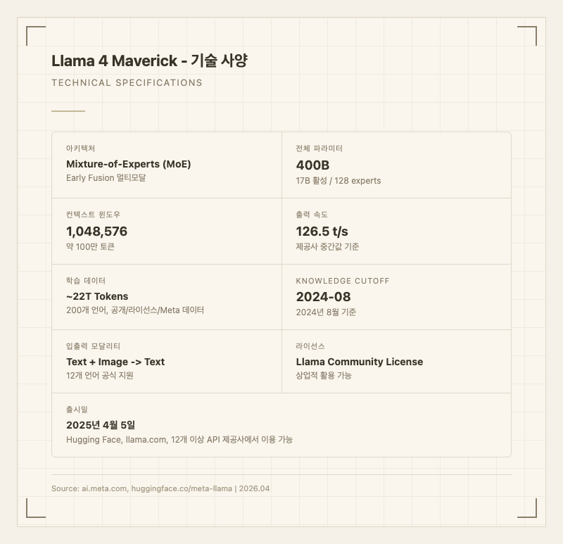 Llama 4 Maverick은 Meta가 2025년 4월 5일에 공개한 400B 규모의 Mixture-of-Experts(MoE) 기반 대규모 멀티모달 언어 모델이다. 128개의 전문가(expert) 중 추론 시 1개만 활성화하는 구조로, 실제 사용되는 파라미터는 17B에 불과하다. 400B급 모델의 지식 용량을 유지하면서도 소형 모델 수준의 추론 비용으로 운용할 수 있다는 것이 핵심 설계 철학이다. Llama 시리즈 최초로 MoE 아키텍처를 채택했으며, Early Fusion 방식의 네이티브 멀티모달을 지원해 텍스트와 이미지 입력을 동시에 처리한다. Llama Community License 하에 오픈 웨이트로 공개되어 상업적 활용과 파인튜닝이 모두 가능하다.