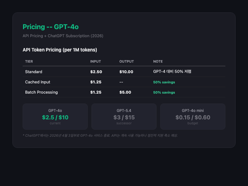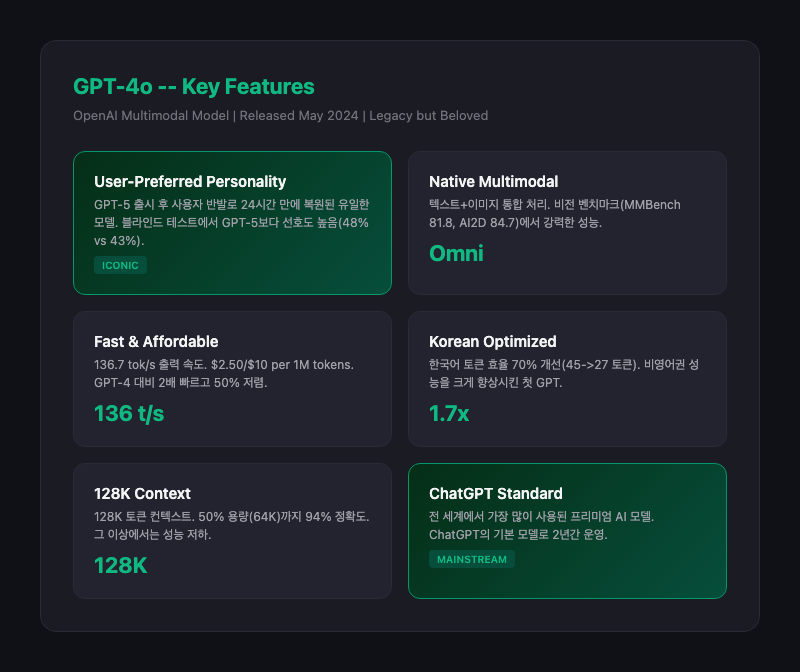 OpenAI가 2024년 5월 13일 출시한 멀티모달 모델. 'o'는 'omni'를 의미하며, 텍스트와 이미지를 동시에 처리하는 통합 모델이다. ChatGPT의 기본 모델로 2년간 운영되며 전 세계에서 가장 많이 사용된 프리미엄 AI 모델이 되었다. 2026년 4월 ChatGPT에서 은퇴했지만, API는 계속 사용 가능하며 사용자들의 강한 애착을 받는 독특한 위치의 모델이다.