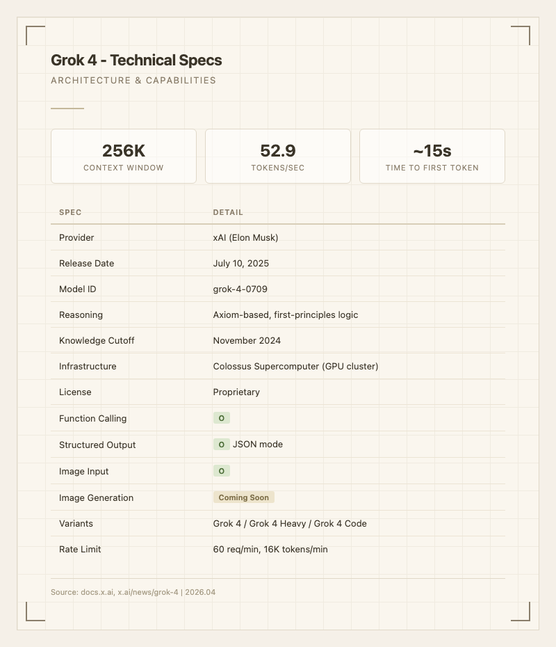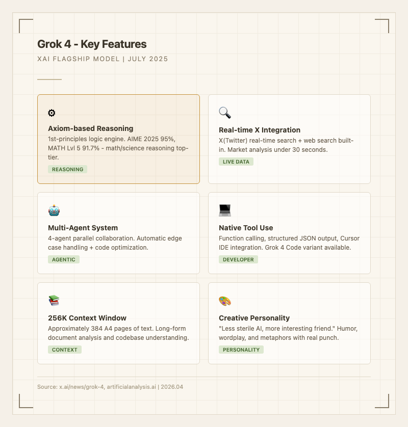 | 변형 | Grok 4 / Grok 4 Heavy / Grok 4 Code |