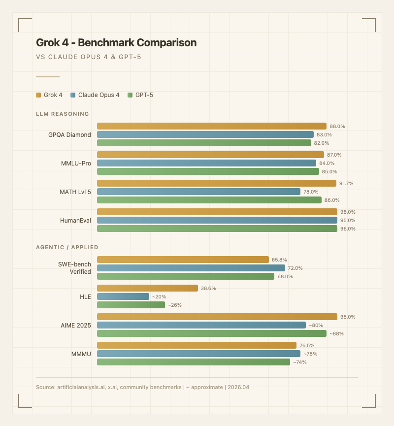 수학/과학 추론: Grok 4가 가장 강한 영역이다. 대학원 수준 과학 문제(GPQA Diamond 88%), 고난도 수학(MATH Lvl 5 91.7%, AIME 2025 95%)에서 최상위권 성능을 보인다. 한국 수능 수학 영역 LLM 평가에서 97.8/100으로 2위를 기록했다 (출처: 2026 한국 CSAT LLM 평가 리더보드). Reddit에서는 "수학 문제는 Grok 4가 가장 믿을 만하다"는 의견이 자주 올라온다.