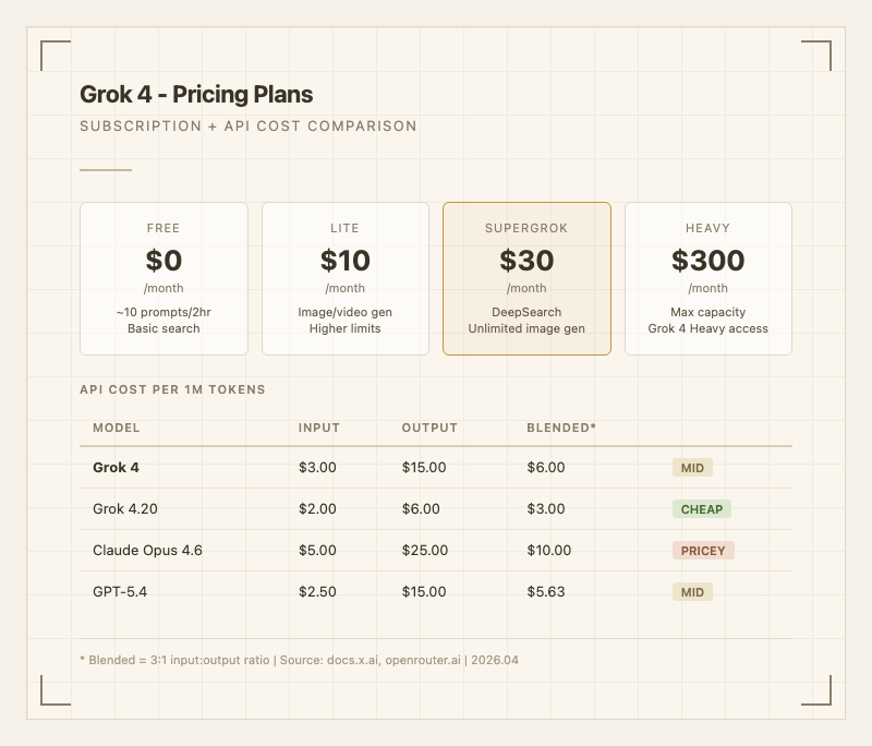 경쟁사 대비: Claude Opus 4.6(25)보다는 저렴하고, GPT-5.4(15)와 비슷하다. Grok 4.20(6)이 출시되면서 "무거운 추론은 Grok 4, 가벼운 작업은 4.20으로" 쓰는 패턴이 생겼다. 한국 사용자들 사이에서 SuperGrok Heavy의 $300/월은 "일반인에게는 너무 비싸다"는 반응이 지배적이다.