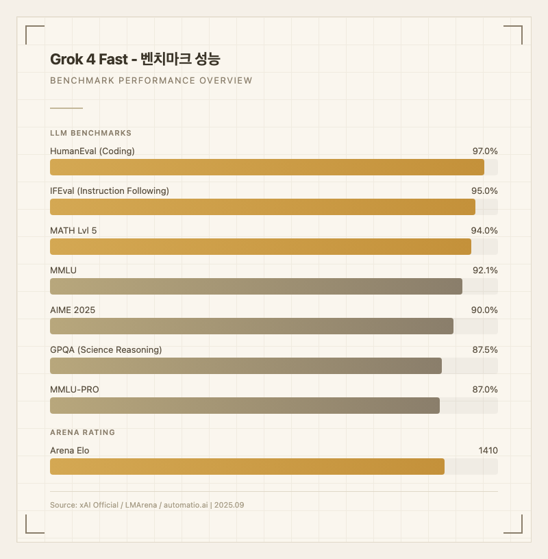 Grok 4 Fast는 비용 대비 성능에서 독보적인 포지션을 차지한다. 주요 벤치마크 결과:
