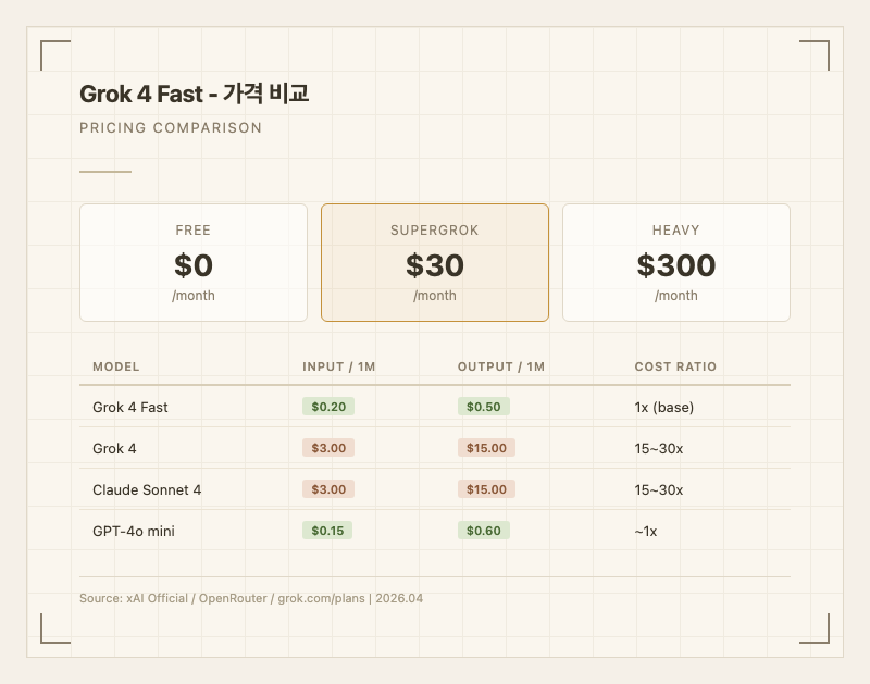 grok-4-fast-reasoning (추론 모드), grok-4-fast-non-reasoning (비추론 모드)reasoning.enabled 파라미터로 제어한다.Grok 4 Fast의 가격 구조는 크게 구독형(소비자)과 종량형(API)으로 나뉜다.