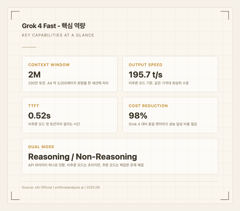 Grok 4 Fast는 xAI가 2025년 9월에 출시한 효율 특화 멀티모달 모델이다. Grok 4의 추론 능력을 거의 그대로 유지하면서 지연 시간과 비용을 대폭 낮춘 모델로, 추론(reasoning) 모드와 비추론(non-reasoning) 모드를 API 파라미터 하나로 전환할 수 있다. 입력 0.50/1M 토큰이라는 파격적인 가격에 200만 토큰 컨텍스트 윈도우까지 제공한다.