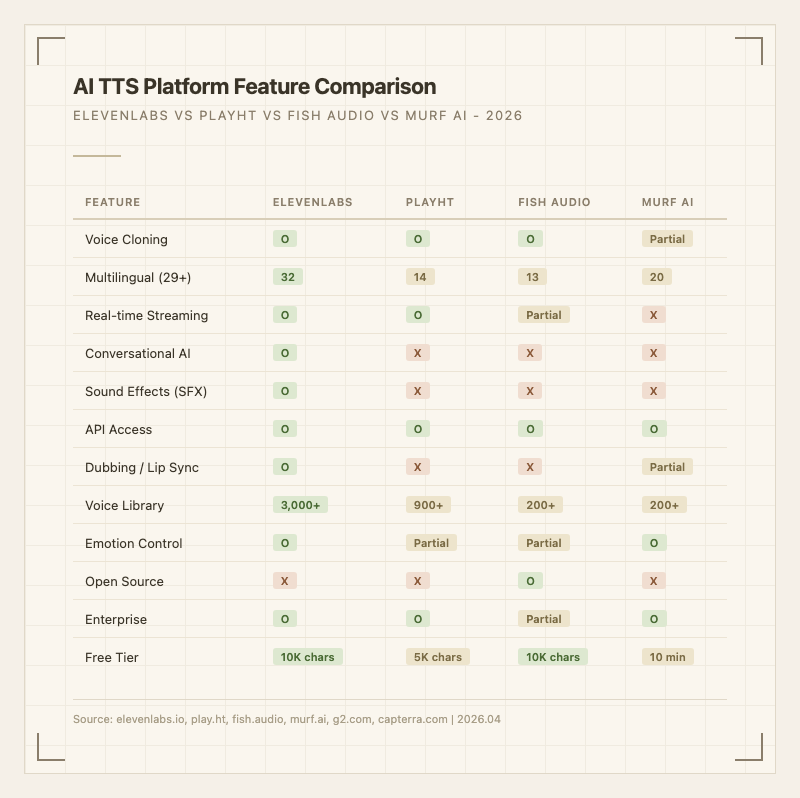 PlayHT는 600개 이상의 음성과 140개 이상의 언어를 지원해서 다국어 커버리지 측면에서는 ElevenLabs보다 넓다. 그러나 ElevenLabs의 Eleven v3 모델은 Audio Tags(예: [whispers], [shouts])로 감정 연출을 세밀하게 제어할 수 있는 반면, PlayHT에는 이에 해당하는 기능이 없다. 실시간 지연시간도 ElevenLabs Flash v2.5가 75ms인데 비해 PlayHT는 200ms 수준이어서 실시간 대화형 에이전트에서는 차이가 난다. PlayHT는 Twilio 통합으로 전화 시스템 연동이 편리하고, 무제한 생성을 제공하는 플랜($31/월)이 있어서 대량 생산에는 가격 효율이 좋다 (play.ht).