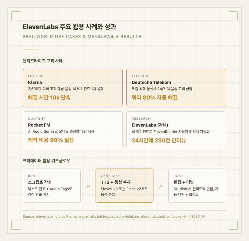 Deutsche Telekom - 유럽 최대 통신사 Deutsche Telekom은 ElevenLabs 음성 에이전트를 고객 서비스에 도입해서 24시간 대기시간 없는 상담을 제공한다. 내부 데이터 기준으로 사용자 쿼리의 약 80%를 AI 에이전트가 자동 해결하며, 특히 문서 관련 질문에서 높은 정확도를 보인다 (elevenlabs.io/blog/deutsche-telekom).